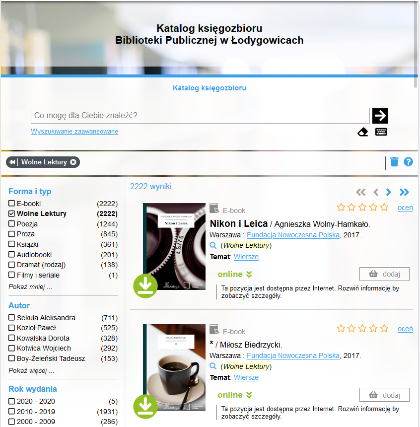 Wybór książek w katalogu on-line bywa spontaniczny, a decyzje o wypożyczeniu konkretnych tytułów podejmowane są często w oparciu o eksponowane okładki dokumentów.