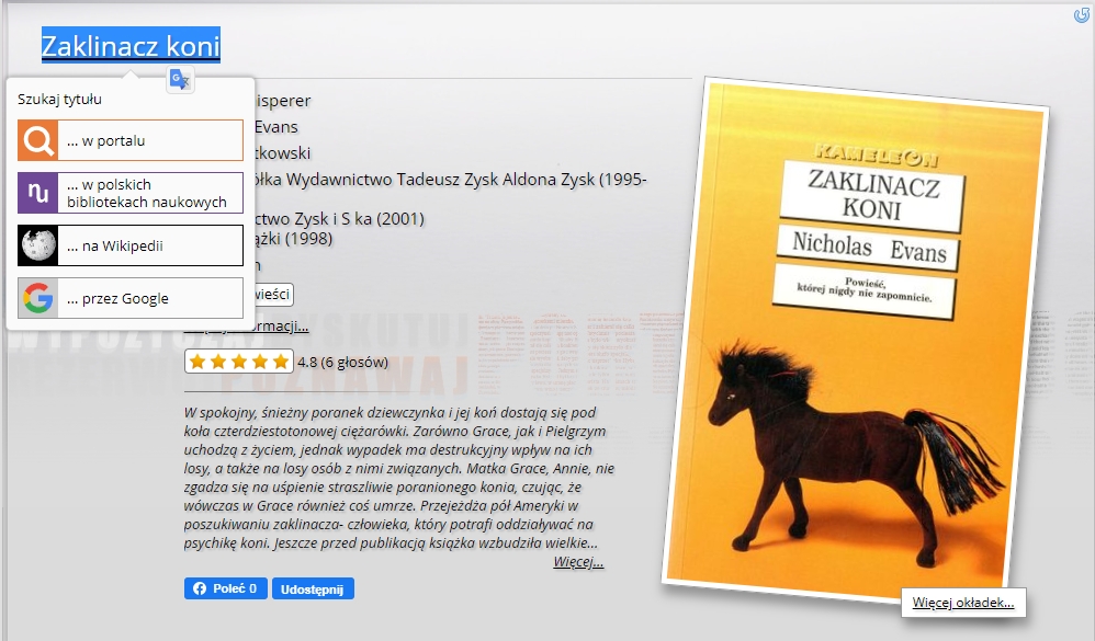 - na stronie dzieła, wszystkie udostępnione informacje bibliograficzne, tj. dane autora, nazwa wydawnictwa, tytuł serii stały się odsyłaczami (linkami) kierującymi do portalu w.bibliotece.pl, Wikipedii oraz Google.com. Zastosowanie hiperłączy ma na celu usprawnienie wyszukiwania informacji o dziełach w portalu oraz poza nim