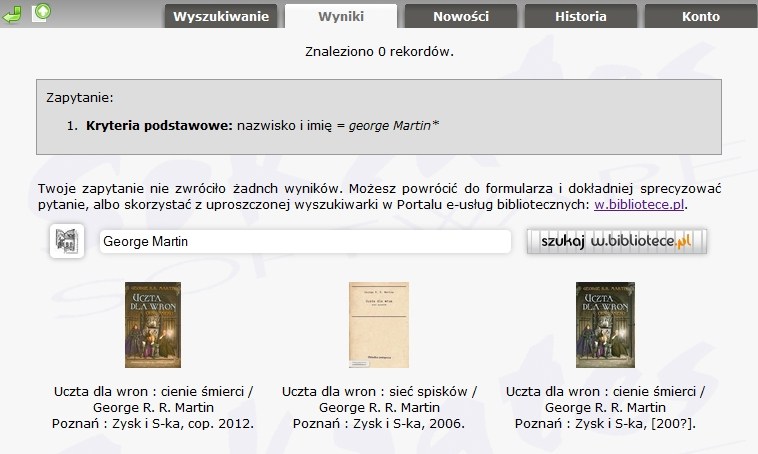 Twoje zapytanie nie zwróciło żadnych wyników. Możesz powrócić do formularza i dokładniej sprecyzować pytanie, albo skorzystać z uproszczonej wyszukiwarki w Portalu e-usług bibliotecznych: w.bibliotece.pl