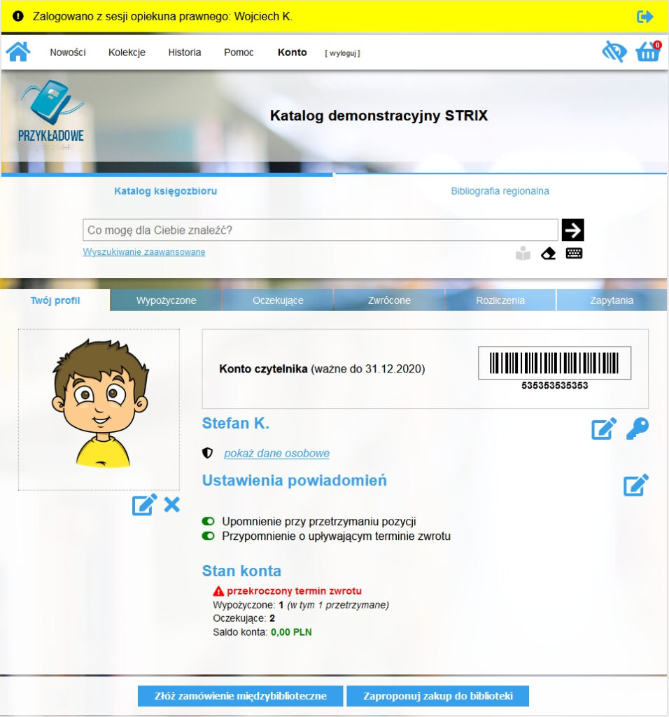 Dzięki temu, czytelnik zapisany w bibliotece, którego wskazano jako opiekuna prawnego (poręczyciela) innego czytelnika, ma możliwość przełączenia konta w tryb zarządzania kontami podrzędnymi. Żółty pasek na górze strony rodzica/opiekuna będzie informował , że korzysta on z katalogu on-line w imieniu osoby trzeciej. Ikonka w prawym górnym rogu pozwoli wrócić na swoje własne konto.