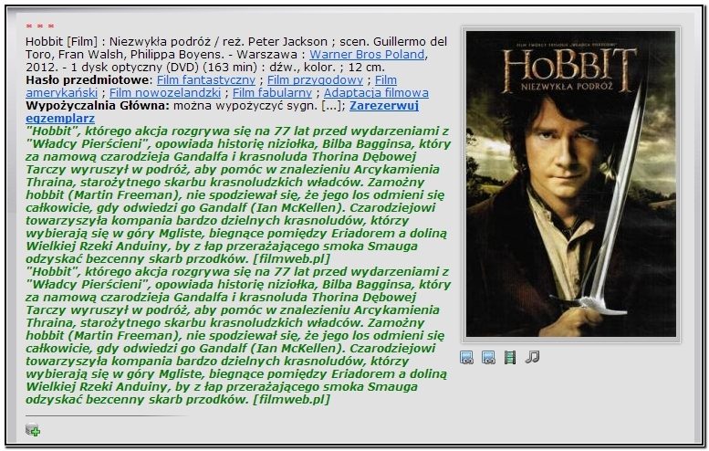 Dołączanie fragmentów treści tekstowych i multimedialnych jest sprawdzonym sposobem na wzbogacenie informacji o zasobach bibliotek. Uatrakcyjnienie rekordów bibliograficznych, szczególnie wtedy, gdy nie wyczerpują one wszystkich informacji o udostępnianym dokumencie tj. abstrakt lub spis treści, jest sposobem na większe zainteresowanie czytelników zbiorami bibliotecznymi. Nowy katalog systemu SOWA2/MARC21 umożliwia dodanie do rekordów załączników tekstowych (PDF) i multimedialnych zawierających strumieniowanie danych audio i video. Atrakcyjna forma udostępnienia tych treści w postaci profilowanych ikon i okien pop-up jest dopełnieniem funkcjonalności nowego katalogu OPAC.