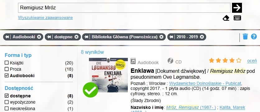 Istotną funkcjonalnością w OPAC jest możliwość „przypinana” filtrów dla konkretnych grup faset. Każdy wybrany filtr w trakcie wyszukiwania jest widoczny w panelu znajdującym się tuż nad wynikami wyszukiwania w formie pinezki. Będzie on automatycznie profilował wyniki wyszukiwania. Rozwiązanie to jest użyteczne, gdy poszukujemy konkretnego typu dokumentu (audiobooka, książki lub filmu) i interesuje nas wybrana agenda biblioteczna lub rok wydania czy produkcji. W bocznej części tego samego panelu znajduje się również ikonka kosza, której użycie umożliwia jednorazowe usunięcie wszystkich wcześniej założonych filtrów.
