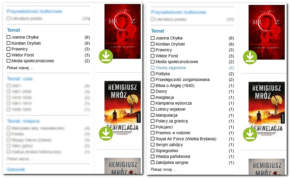 Przesłane propozycje dotyczące funkcjonalności wyszukiwania w OPAC wskazywały na ograniczenia związane z prezentacją zawartości tylko 10 faset w wynikach wyszukiwania w poszczególnych grupach, tj. Forma i typ, Temat, Gatunek, itd. Wstępnym rozwiązaniem tego problemu stało się udostępnienie 5 najczęściej wypełnionych deskryptorów w poszczególnych blokach faset, dzięki czemu układ faset stał się bardziej przejrzysty i klarowny, ułatwiając czytelnikowi szybsze dotarcie do poszukiwanego zagadnienia, szczególnie gdy korzystał on z katalogu na smartfonie. Natomiast pełnym rozwinięciem tej koncepcji stało się udostępnienie opcji „Pokaż więcej…”, znajdującej się w grupach faset, która rozwija listę 5 faset do nawet 100, udostępniając frazy w poszczególnych kryteriach.
