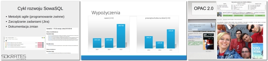 Ostatnie wystąpienie System biblioteczny SowaSQL przedstawił Michał Fryska z firmy Sokrates-software. Główny architekt katalogów WWW systemów SOWA, skupił się na ilości danych, które gromadzą biblioteki wykorzystujące oprogramowanie biblioteczne SowaSQL. Wdrożenia systemów bibliografii regionalnej w województwach: podkarpackim, łódzkim czy małopolskim wynoszą aż 240 tys. rekordów dla każdej instalacji. Wybrane biblioteki miejskie w Opolu, Elblągu, Tarnowie, Chełmie czy Krakowie (KBP, ŚBP, PBP) operują ok. 300 tys. rekordów i ponad 450 tys. egzemplarzy. Liczby te uzasadniają coraz większą profesjonalizację technologiczną oprogramowania, pociągającą za sobą ewolucję systemu SOWA w kierunku rozwiązań SQL.