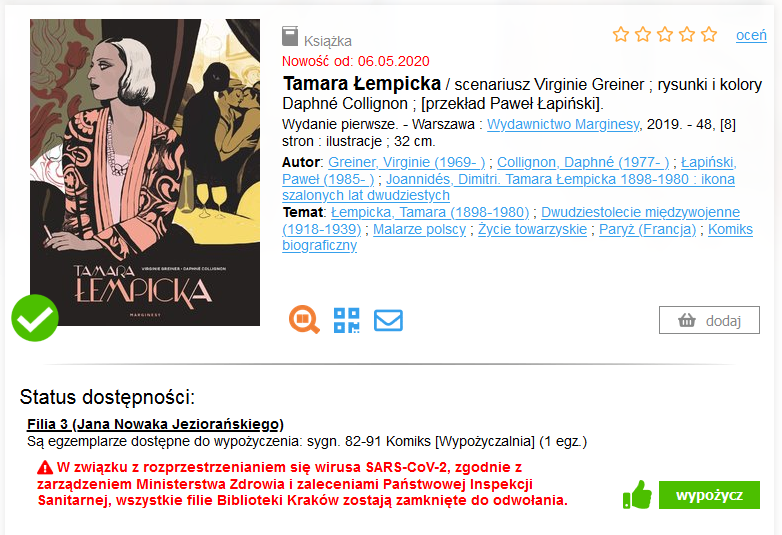 - będzie wyświetlać komunikat w OPAC o przyczynie niedostępności książek, np. Biblioteka zamknięta z powodu… urlopu / skontrum / remontu / zagrożenia epidemicznego / itd.