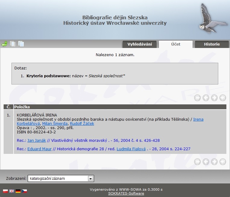 Informujemy, że internetowe katalogi systemów SOWA mogą mieć wielojęzyczny interfejs użytkownika. W podstawowej dystrybucji oprogramowania interfejs dostępny jest jedynie w językach polskim i angielskim*. Adaptacja wersji językowych dla kolejnych dwóch języków (niemieckiego i czeskiego) została właśnie zaimplementowana w Bibliotece Instytutu Historycznego Uniwersytetu Wrocławskiego.