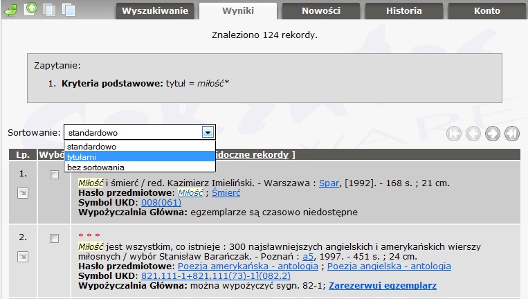 1. Wyróżnianie elementów frazy wyszukiwawczej w wynikach – np. poszukując w tytule Miłość, w wynikach zostanie podkreślone: Miłość i śmierć